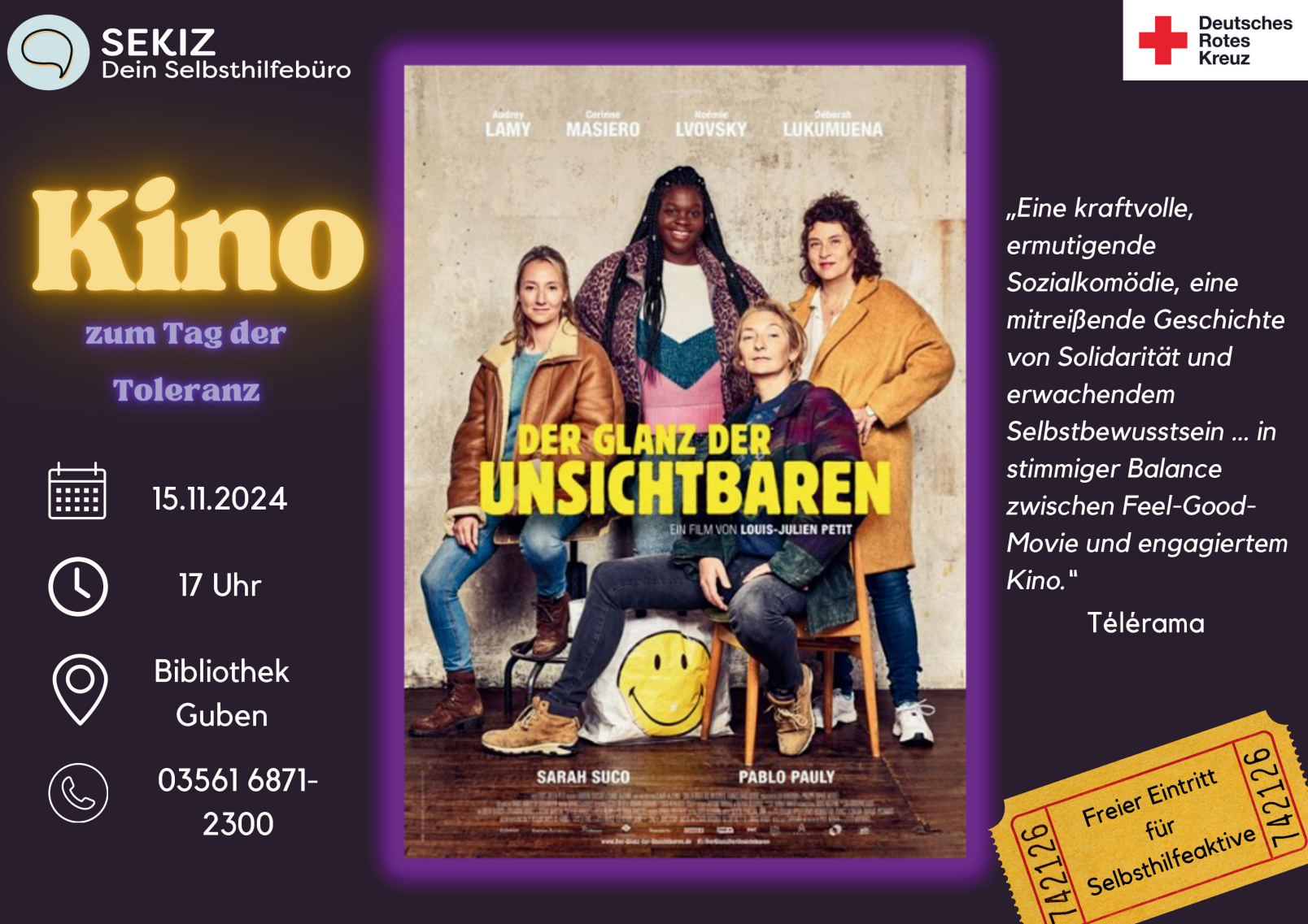 Unser SEKIZ – Dein Selbsthilfebüro in Guben lädt zum Kinonachmittag. Anlässlich des Tages der Toleranz wird am 15. November 2024 „Der Glanz der Unsichtbaren“ gezeigt. Der Film startet um 17 Uhr in der Bibliothek in Guben. Selbsthilfeaktive haben freien Eintritt.